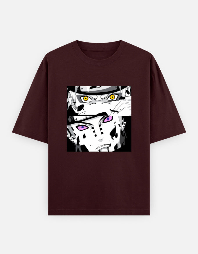 This intense split-panel illustration captures a pivotal moment from Naruto Shippuden: the confrontation between Naruto Uzumaki and Pain. The upper half showcases Naruto in Sage Mode, his golden eyes blazing with fury and resolve. Below, Pain stares back with the godly Rinnegan, his expression cold and unwavering. The heavy contrast, ink-splattered faces, and piercing eyes symbolize their opposing ideologies—hope vs. despair, peace through strength vs. peace through pain. This minimalist, high-impact composition freezes the emotional apex of their legendary battle.